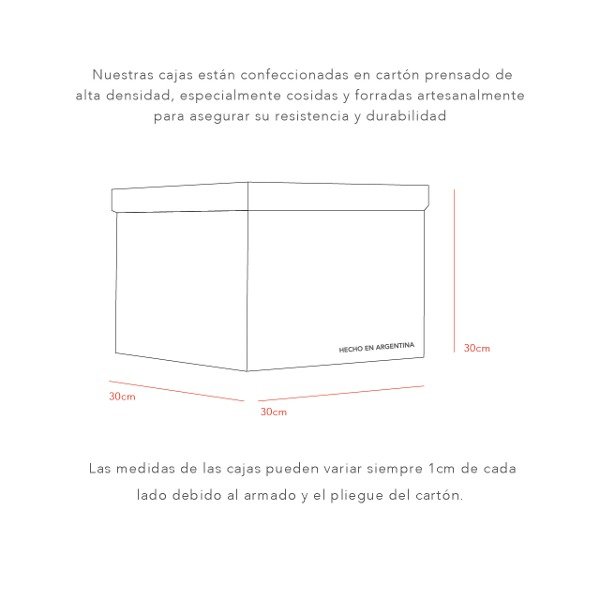 Nuestra línea de cajas está pensada para ordenar y optimizar tus espacios. Todas nuestras cajas son producidas artesanalmente a partir de cartón prensado de alta densidad, montadas en su interior con papel blanco, cosidas y forradas a mano para asegurar su resistencia y durabilidad. Industria Argentina.