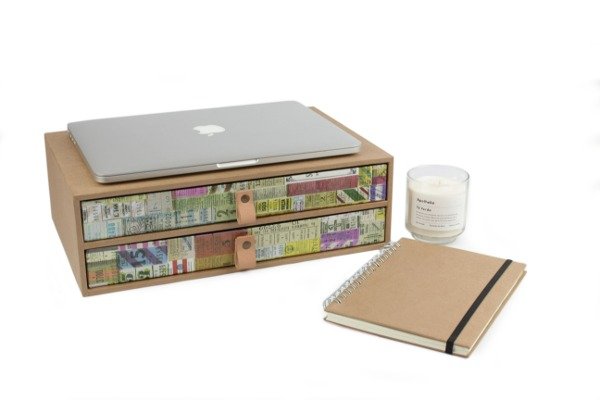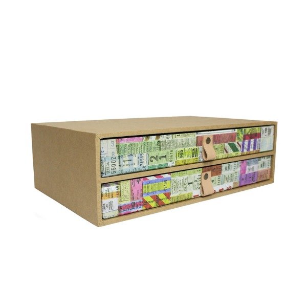 Módulo 2 cajones organizador. Estructura de madera con cajones en cartón prensado de alta densidad, cosidos con alambre y forradas artesanalmente para asegurar su resistencia y durabilidad.