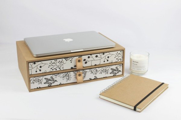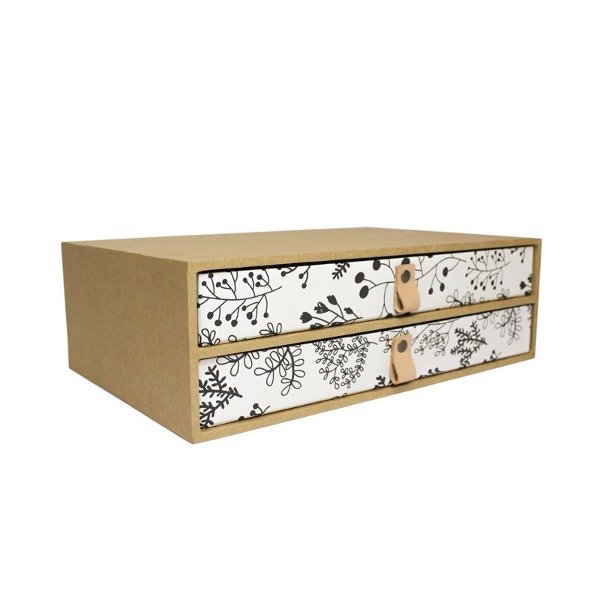 Módulo 2 cajones organizador. Estructura de madera con cajones en cartón prensado de alta densidad, cosidos con alambre y forradas artesanalmente para asegurar su resistencia y durabilidad.