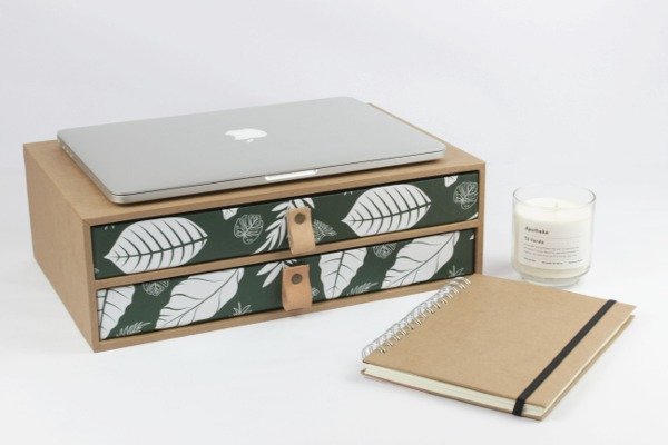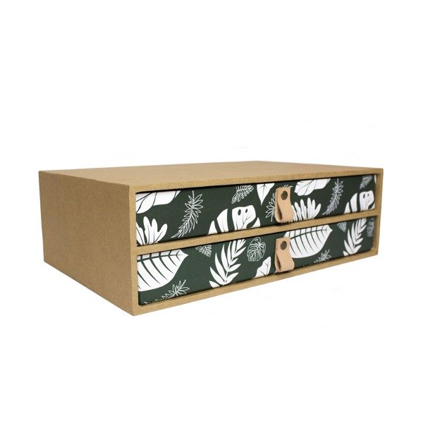 Módulo 2 cajones organizador. Estructura de madera con cajones en cartón prensado de alta densidad, cosidos con alambre y forradas artesanalmente para asegurar su resistencia y durabilidad.