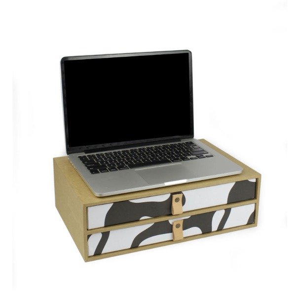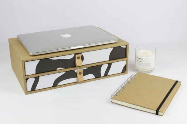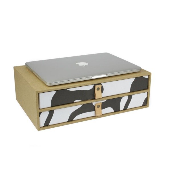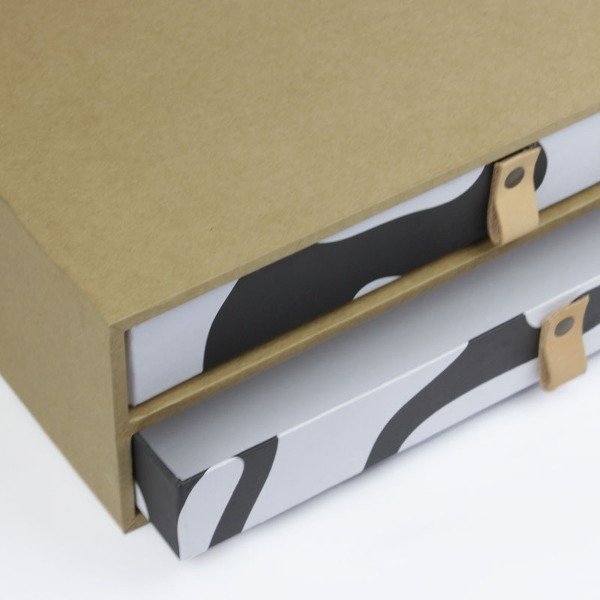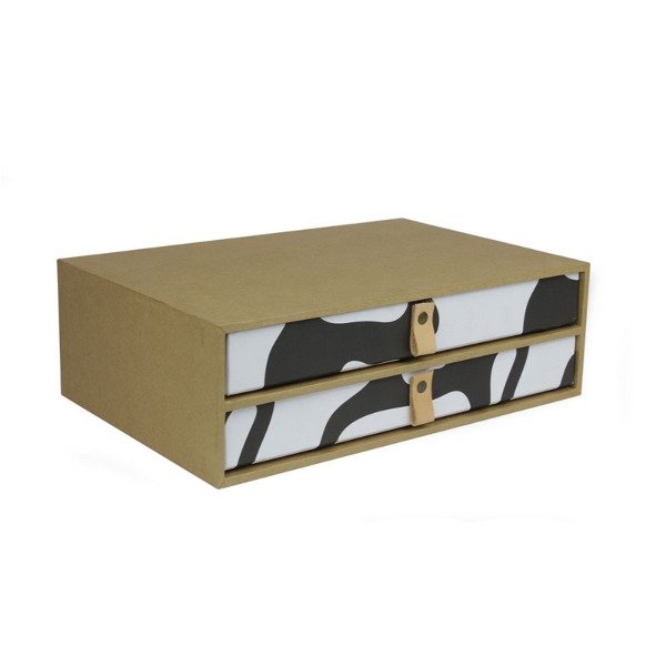 Módulo 2 cajones organizador. Estructura de madera con cajones en cartón prensado de alta densidad, cosidos con alambre y forradas artesanalmente para asegurar su resistencia y durabilidad.