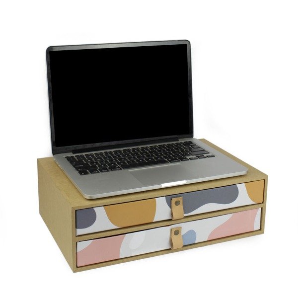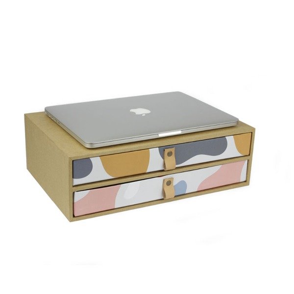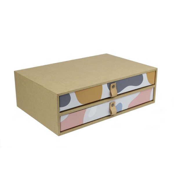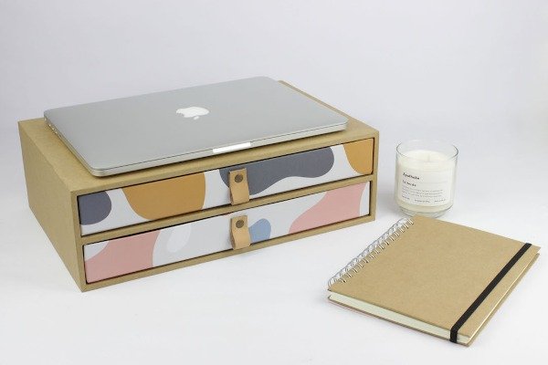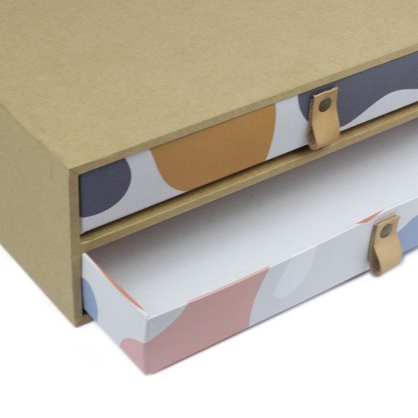Módulo 2 cajones organizador. Estructura de madera con cajones en cartón prensado de alta densidad, cosidos con alambre y forradas artesanalmente para asegurar su resistencia y durabilidad.