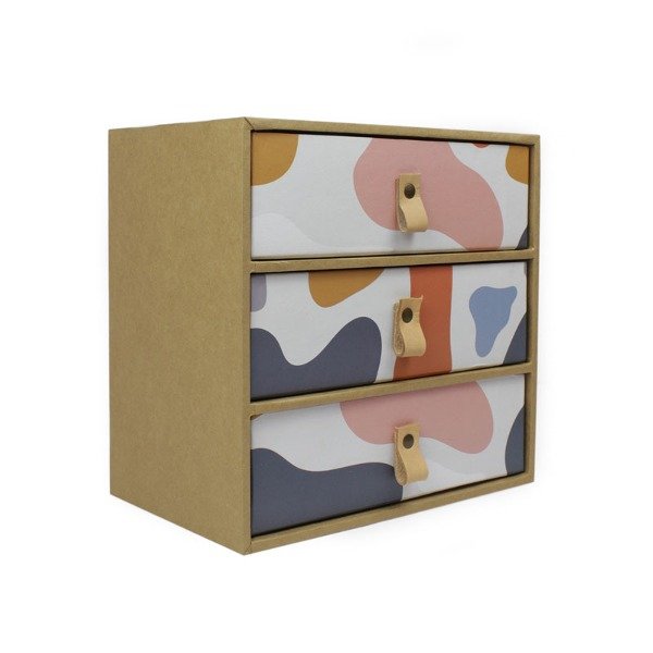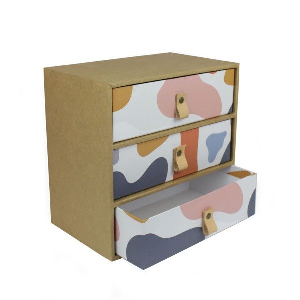Módulo 2 cajones organizador. Estructura de madera con cajones en cartón prensado de alta densidad, cosidos con alambre y forradas artesanalmente para asegurar su resistencia y durabilidad.