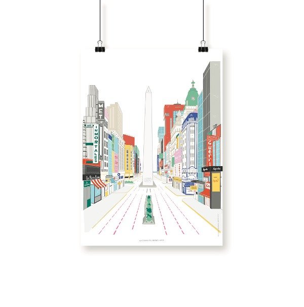 Ilustración por Josefina Jolly de la colorida Av. Corrientes mirando al obelisco
