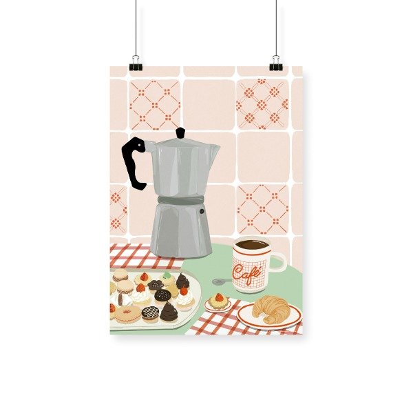 Ilustración por Eugen Dibuja y una rica mesa cafetera con masitas